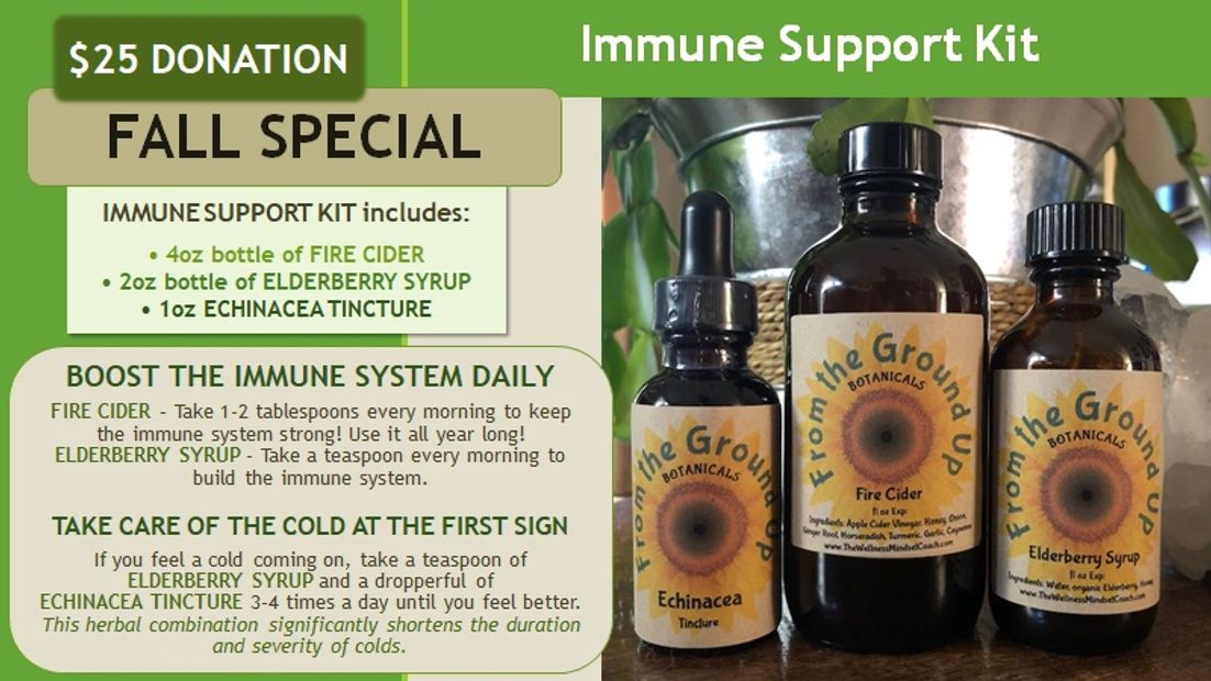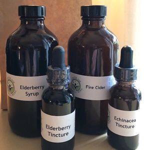 Immune Support Kit includes: 4 oz bottle of Fire Cider, 2 oz bottle of Elderberry Syrup, and 1 oz of Echinacea Tincture